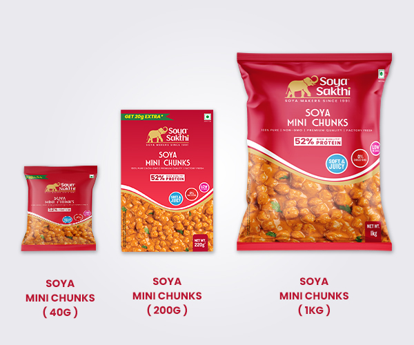 Measuring approximately 10–12 mm, Mini Chunks offer the same high-quality protein in a smaller, softer format. They cook faster and blend beautifully into light gravies, mixed vegetable dishes, and everyday meals.